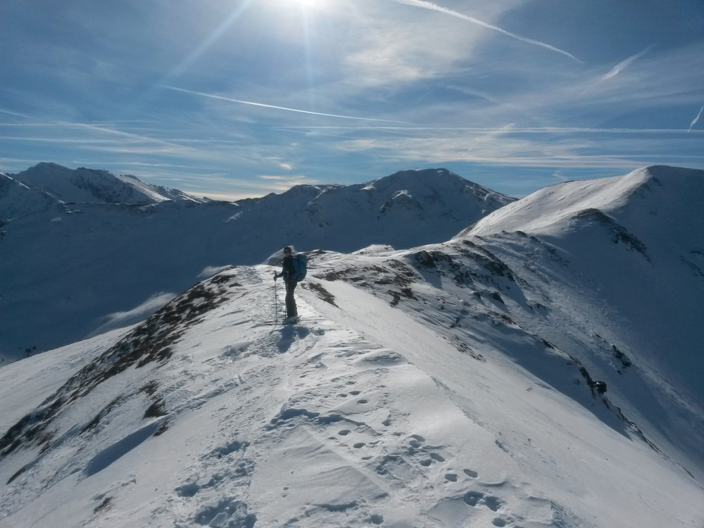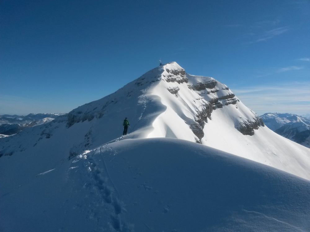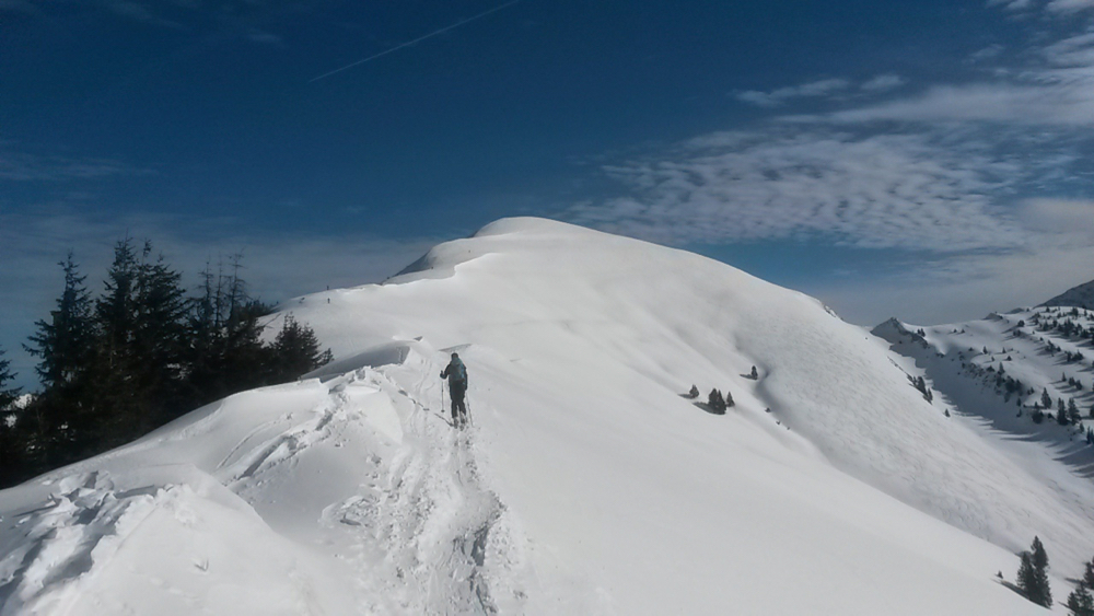 Den kurzen Rücken zum Gipfel stapfen wir bei böigem Wind hin...
