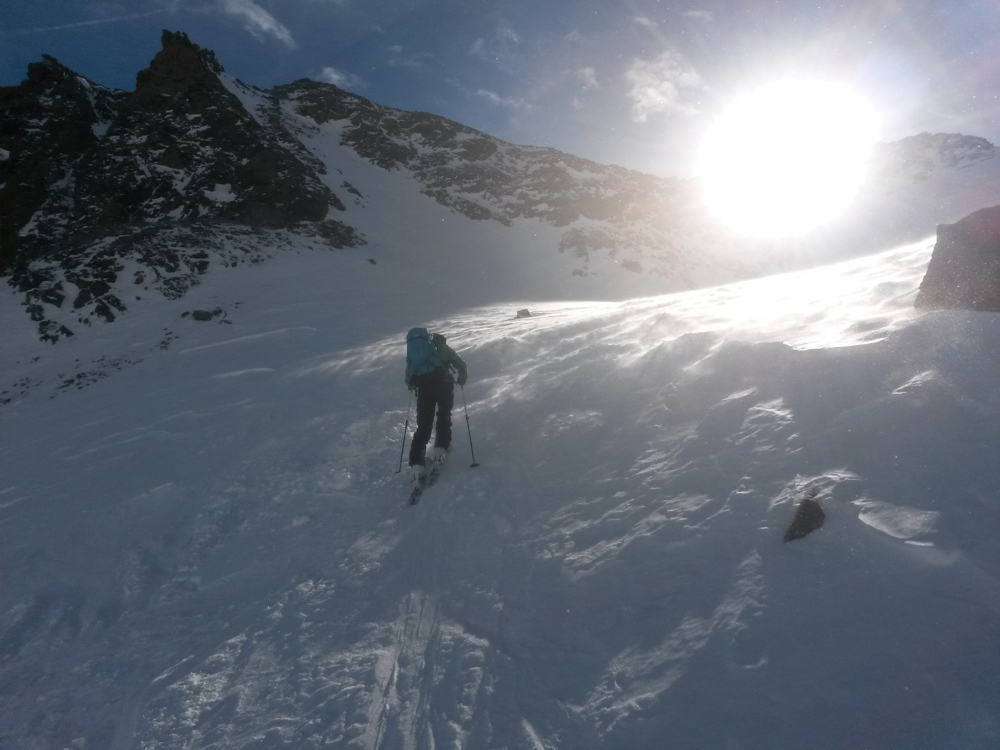 Bis zum Joch sind die Bedingungen recht gut, aber kaum kommen wir über den Kamm des Südgrats, stehen wir