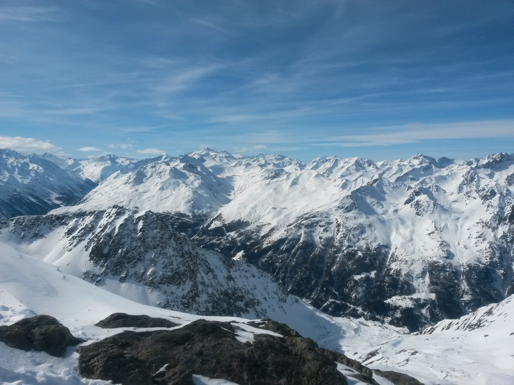 ...lacht uns schon wieder die Sonne. Wir können das Skigebiet von Sölden auf der anderen Seite des Ötztals gut