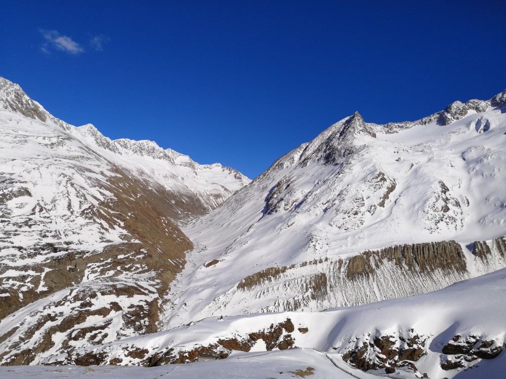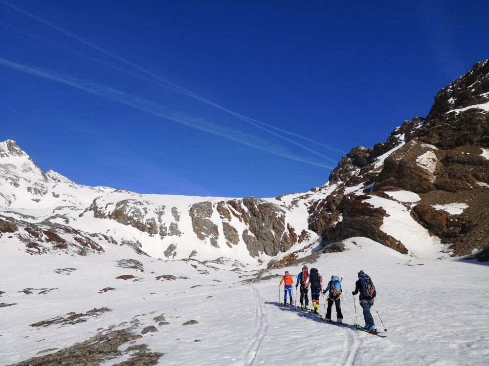 Daß die Schneesituation dennoch grenzwertig dünn ist, wird beim Blick in die Seitentäler sichtbar. Wir sind gespannt, ob wir überall auf der auf