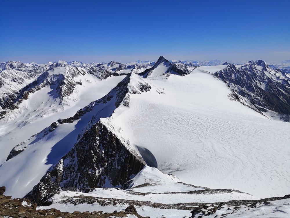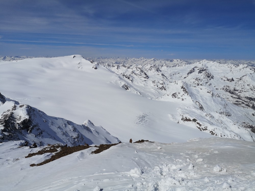 Ein Blick zurück auf unseren Gipfel zeigt, wie lange die Abfahrt gewesen ist. Die Weißkugel ist der ferne schattige Berg am Horizont in der linken