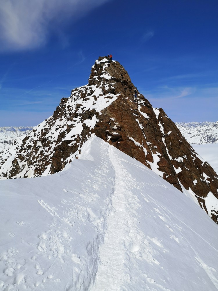 Am Skigipfel der Weißkugel angekommen machen wir das Skidepot und legen für die letzten Meter zum Gipfel über den teilweise ausgesetzten Gipfelgrat