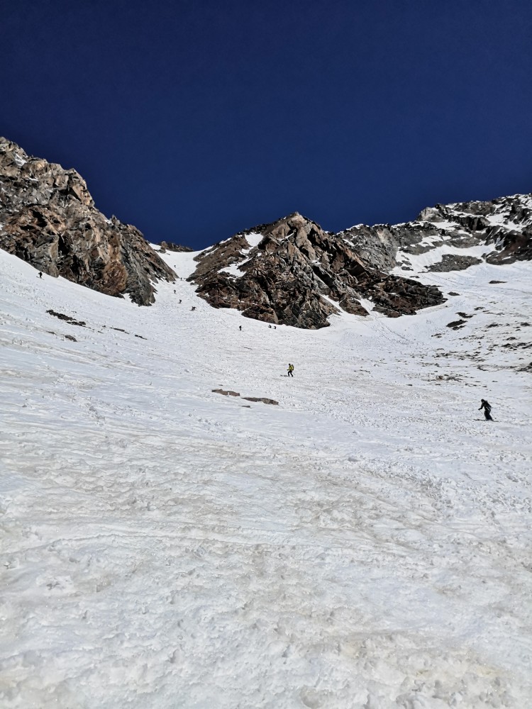 Das letzte Viertel der Abfahrt fällt dann wieder etwas ruppiger aus. Die niedrige Schneelage veranlaßt uns zu einem Slalom um Steine und Faulstellen