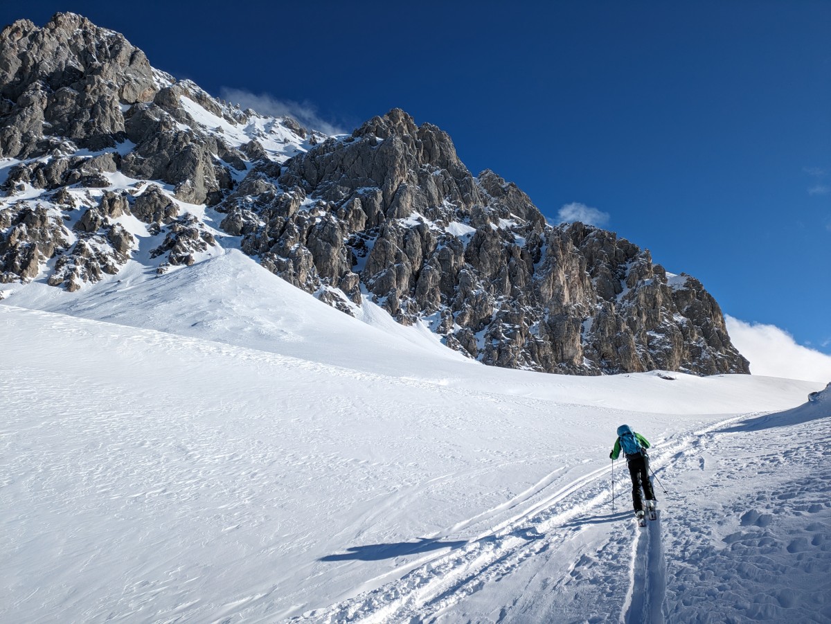 In der darauffolgenden wunderbar langen Abfahrt blicken wir auf die Westseite des Iglskopfes - eine Skispur zieht direkt in ihr zum Gipfel. Respekt!