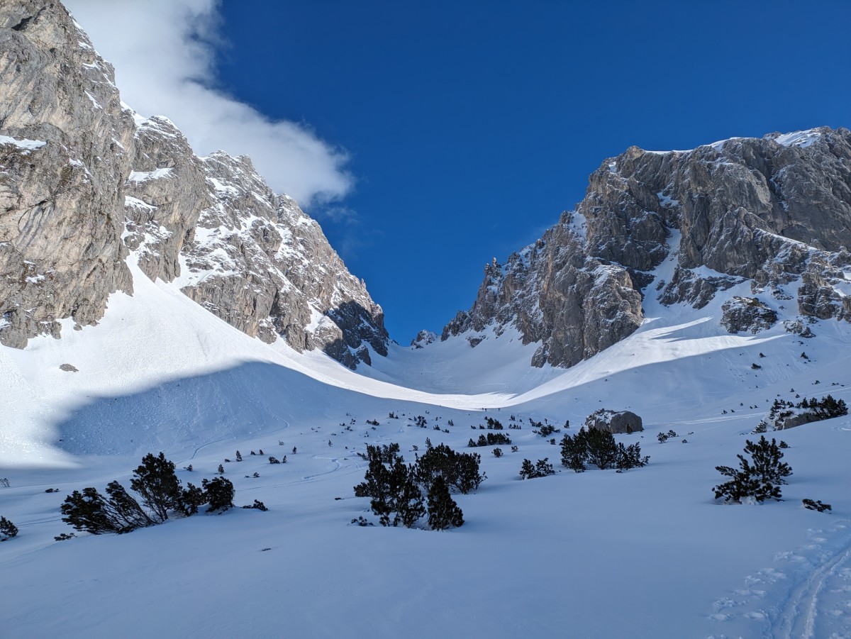 An der Loipe angekommengeht unser Blick noch einmal zurück in die lange Abfahrt in einem hochalpinen Ambiente. Ein Traum!