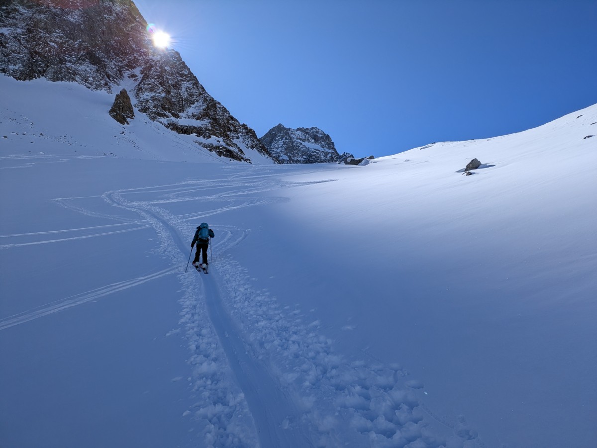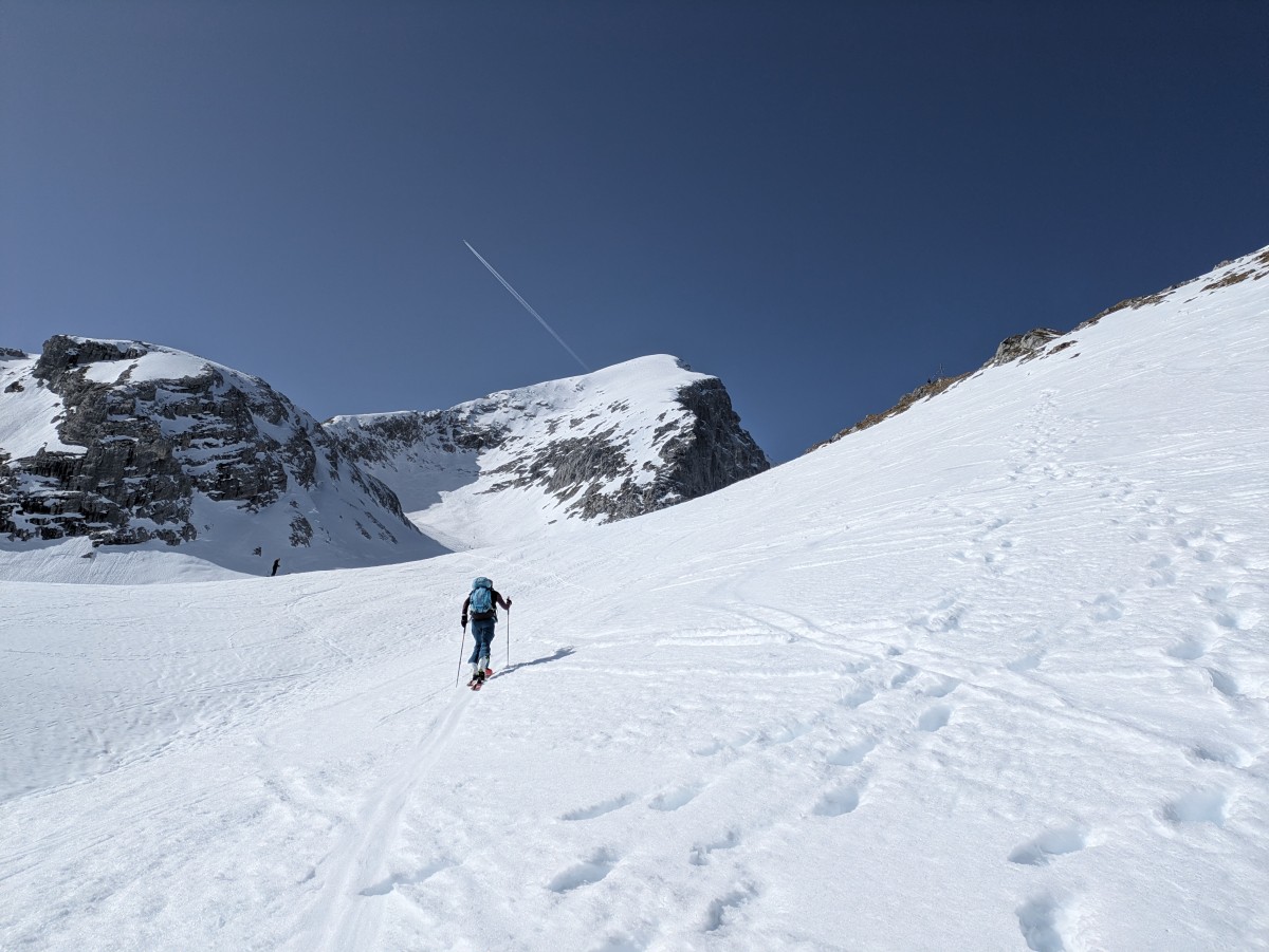 Es ist nicht einfach, bei den schneearmen Bedingungen eine gute Linie nach oben zufinden, aber Richtung Zalimkopf klappt es einigermaßen.