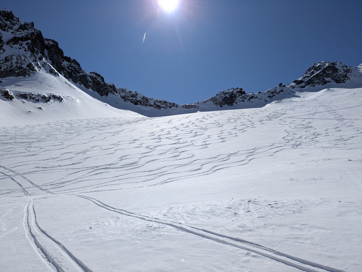 Beim Anblick dieser Spuren freuen wir uns bereits auf die Abfahrt unter dem blauen Himmel dieses Traumtages.
