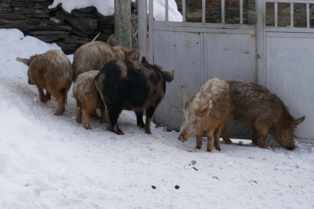 Freilaufend im Dorf findet sich neben Pferden, Rindern und Hunden auch das Borstenvieh.