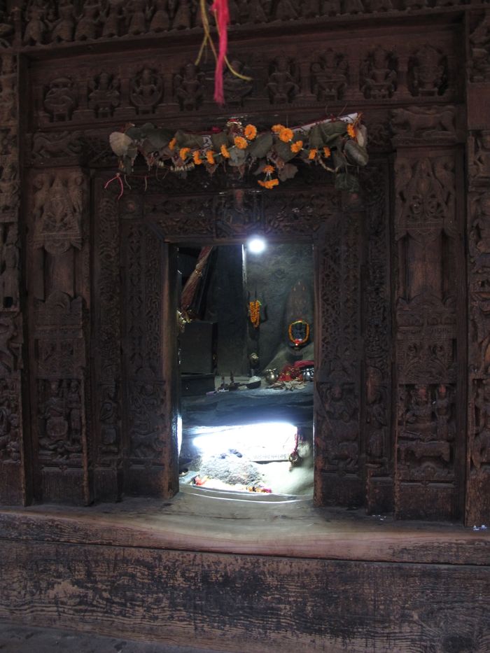 Im Tempelraum ist der für Shiva typische Dreizack zu sehen, geschmückt mit einer Tagetes-Girlande.