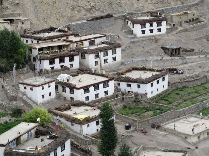 Die Siedlung Dhankar mit typischen Flachdächern. An deren Rändern wird Feuerholz für die kalte Zeit gelagert.