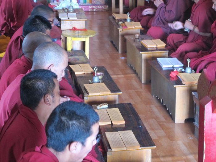 Buddhistische Mönche bei einer Zeremonie; vor ihnen die heiligen Schriften