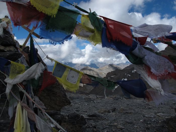 Auf der Passhöhe (knapp über 5600m) - Gebetsfahnen markieren den Übergang ins Parang-Tal