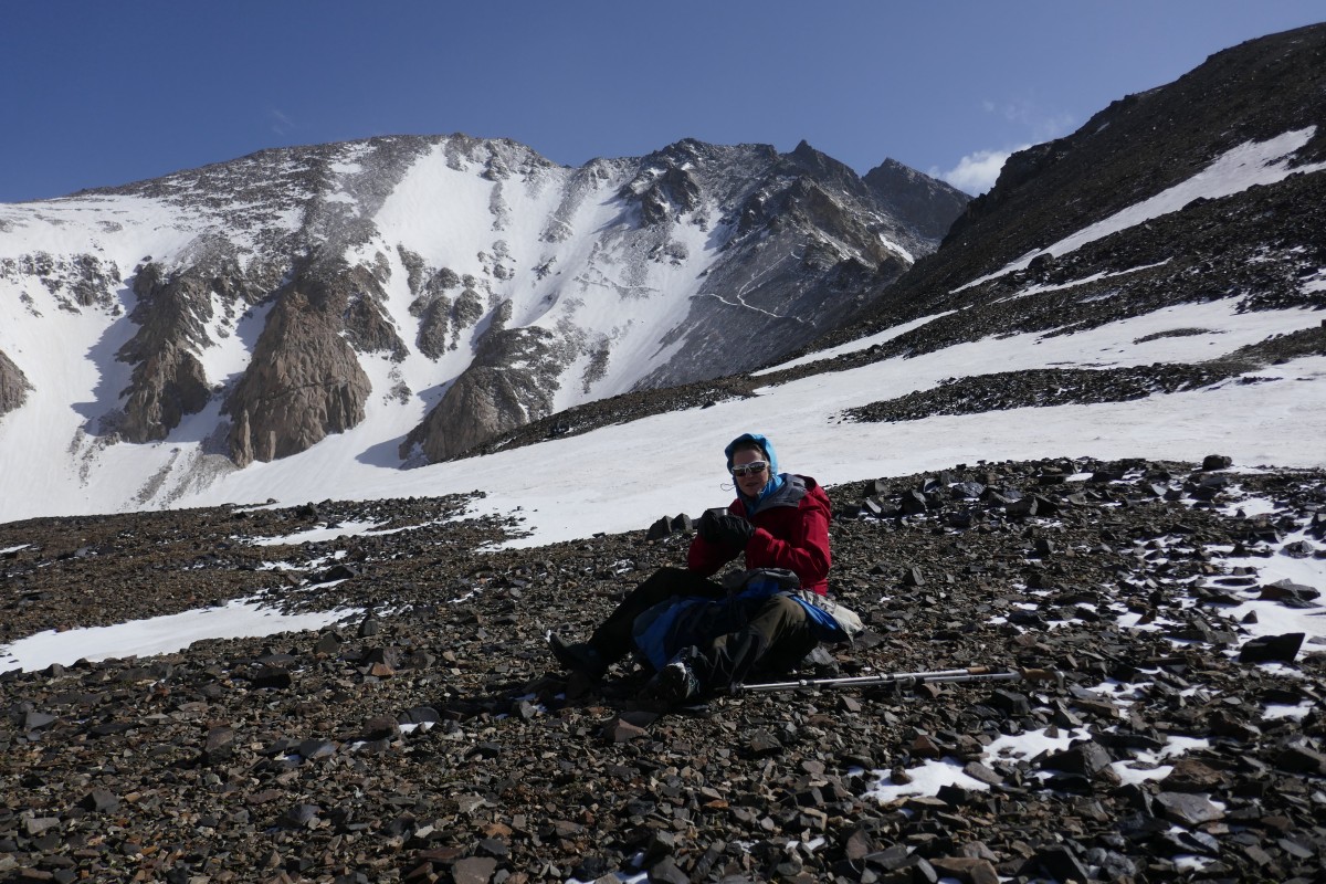 Die schöne Wanderung über trittfesten Sommerschnee und über Geröll führt uns schließlich auf ein Gipfelplateau auf etwa 4200 Meter über Null. Wir brotzeiten