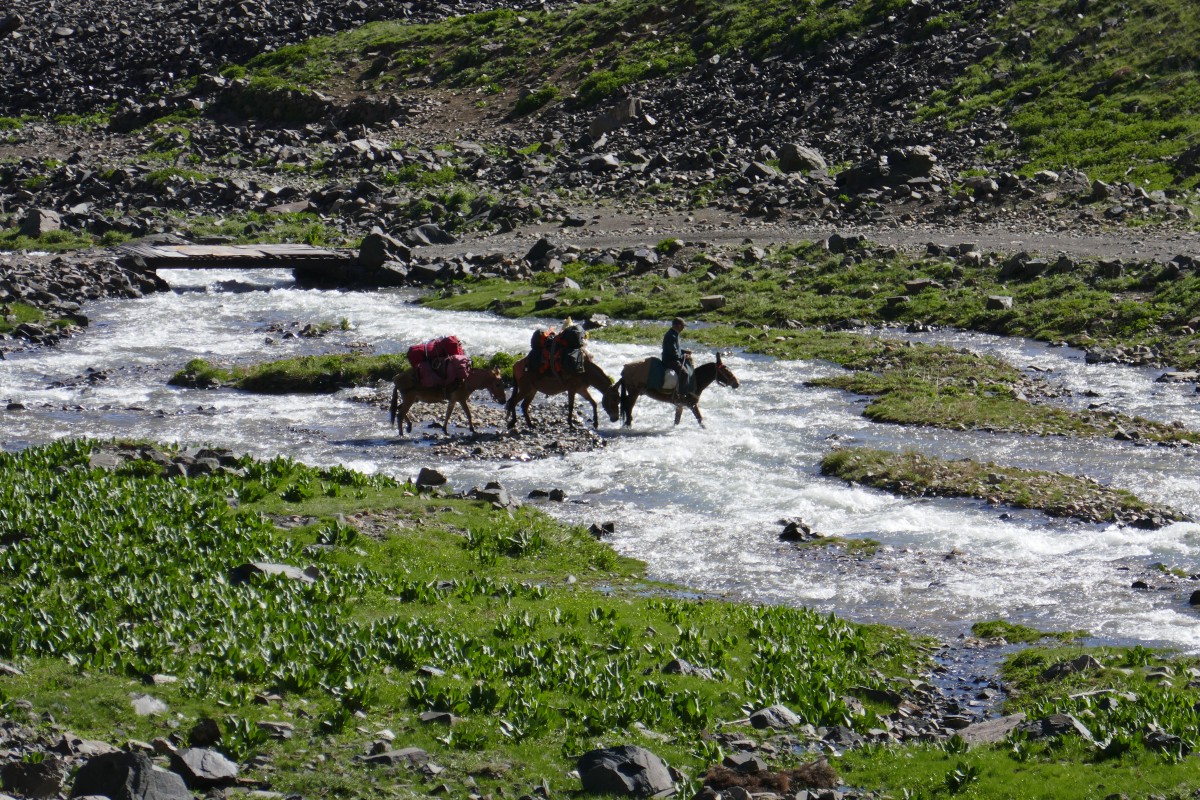 Unsere kleine Mulikarawane überquert fotogen den munteren Bach.