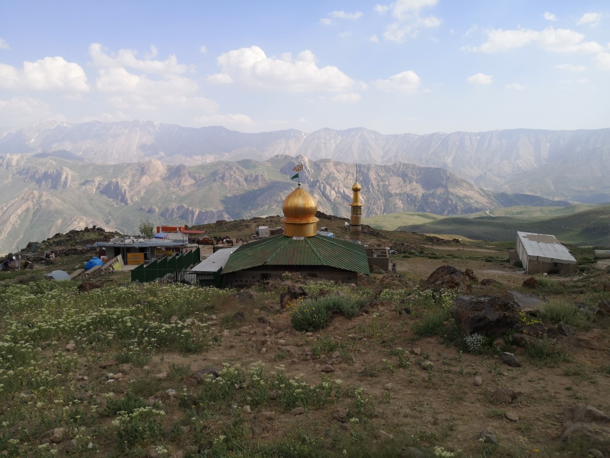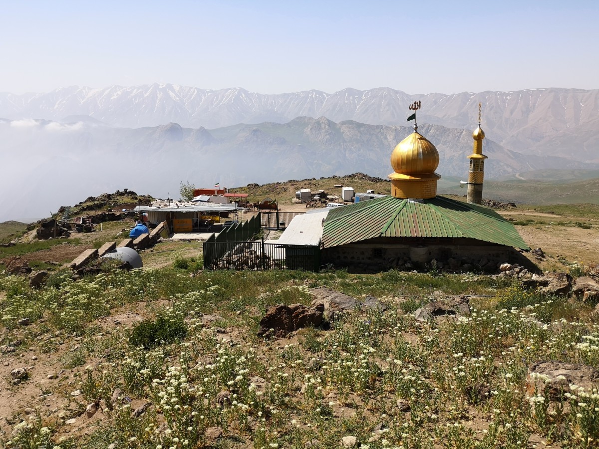 Endlich kommen wir an einem der bekanntesten Fotomotive einer Iran-Bergsteigerreise an: Die kleine Moschee bei Gosfandsara mit goldener Kuppel und Minarett vor dem