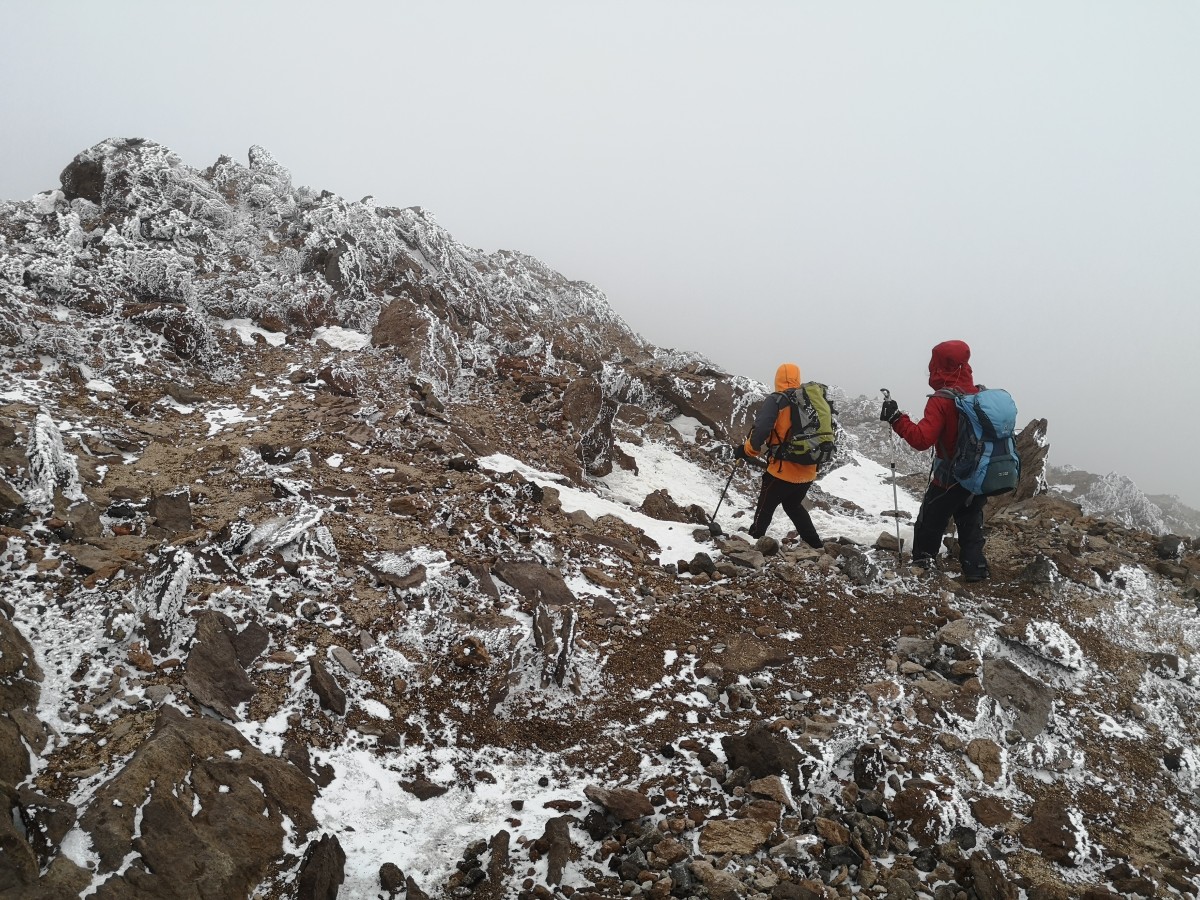 Auch nach zwei Stunden Steigen im Nebel hat sich diese Hoffnung nicht erfüllt. Wir steigen in böigem Wind auf, der uns und die Umgebung mit Reif überzieht. Sichtweite dreißig
