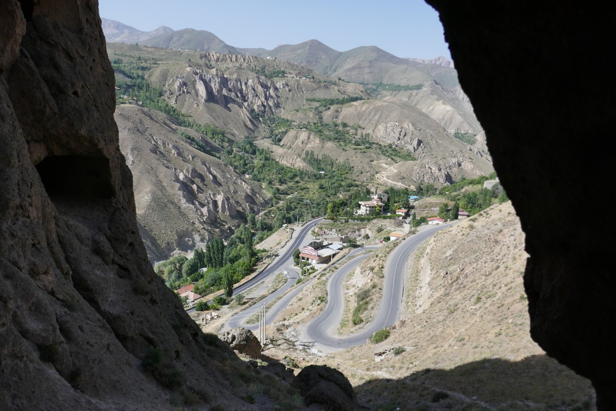Im Blick aus den Höhlenfenstern nach unten schlängelt sich die Straße die steilen Talhänge empor.