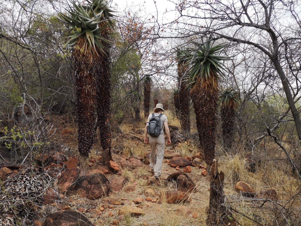 Nach der Verpflegung unternehmen wir einen weiteren Spaziergang in der Umgebung der Lodge. Wir wandern zwischen Aloe-Pflanzen und Termitenhügel durch eine
