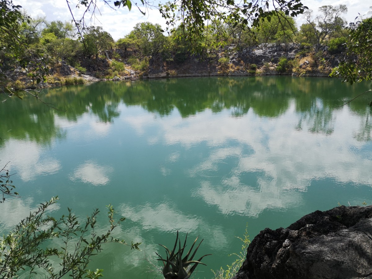 Quasi ums Eck liegt unser nächster Stop: Lake Otjikoto. Der durch Einsturz einer Höhlendecke entstandene kreisrunde und relativ tiefe See wurde von den abziehenden