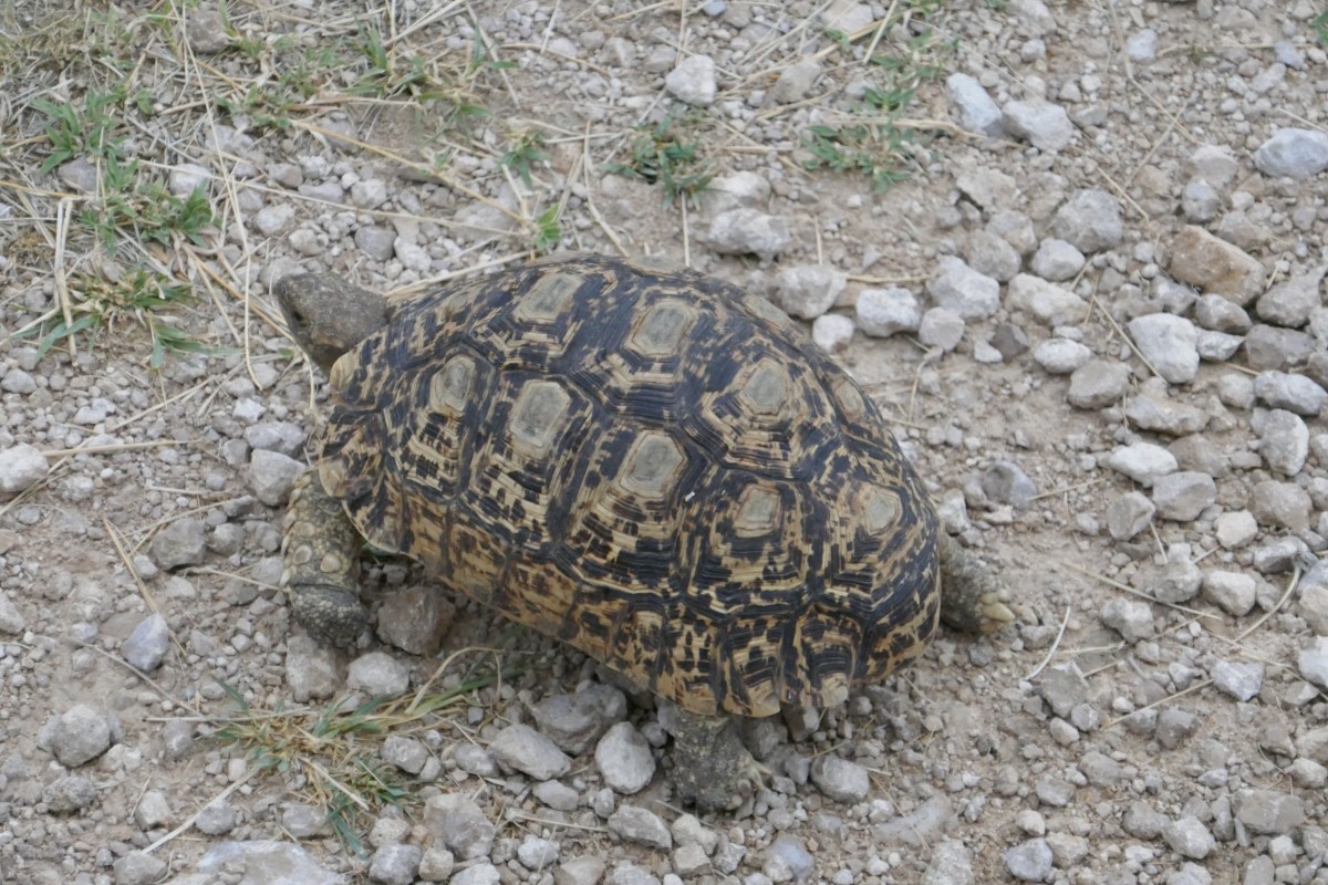 Auf unserer Reise wird es uns nicht vergönnt sein, einen Leoparden zu sehen - dafür immerhin eine Pantherschildkröte, englisch Leopard Tortoise.