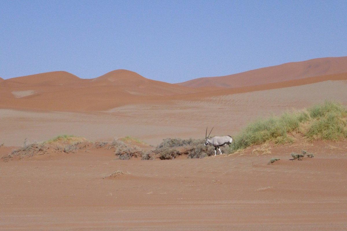 Auch eine Oryx wandert durch die sandige Landschaft. Wohin es die Tiere wohl zieht?