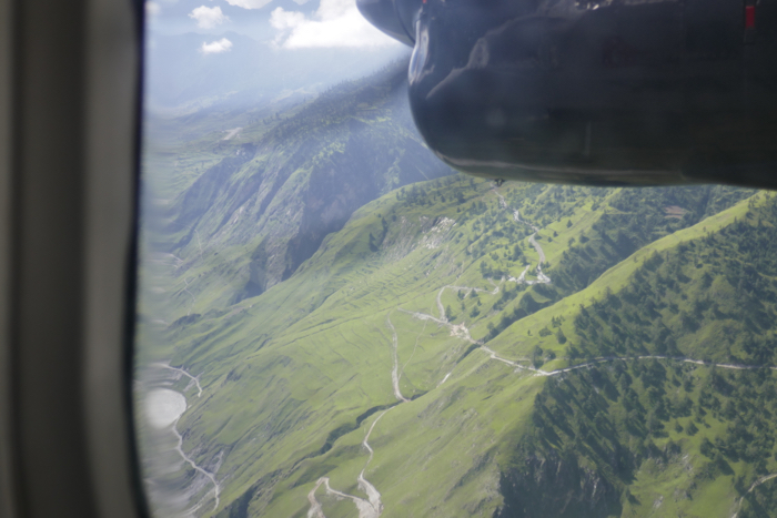 Blick aus dem Flugzeug kurz vor der Landung. Wer genau hinsieht, erkennt bereits im linken oberen Bereich des Bildes die winzige Landebahn Juphals -