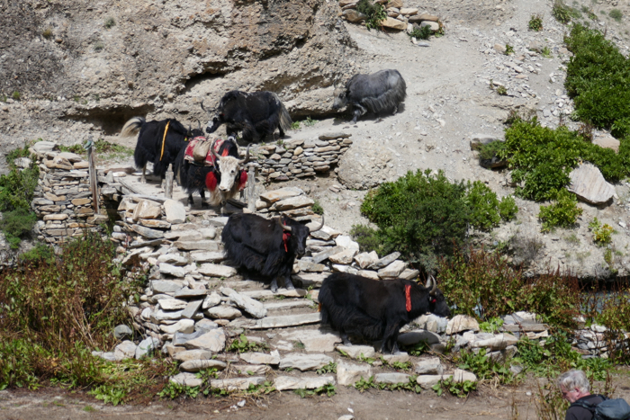 Die Yakherde mit der Heubeladung dagegen zieht brav und friedlich hübsch aufgereiht ihres Weges den steilen Pfad weiter.