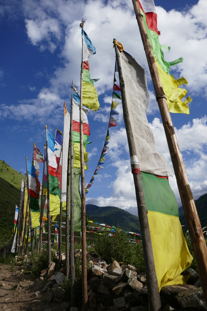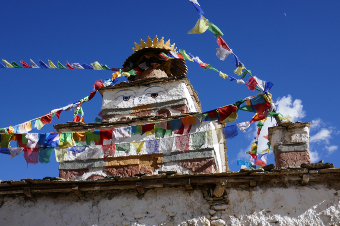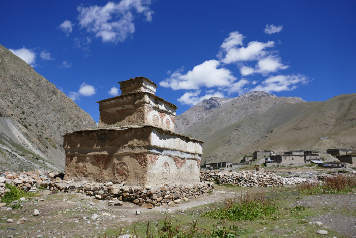 Die schöne Ortschaft empfängt uns bei bestem Wetter mit einer großen Chörten.
