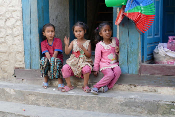 Kleine Beobachterinnen betrachten neugierig die Karawane mit uns Touristen, die sich durch die hübschen Dörfchen zwischen Juphal und Dunai zieht.