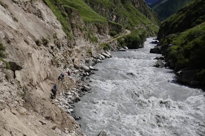 Der Weg verläuft nun am Thuli Beri entlang. Immer wieder müssen wir Stellen passieren, an denen der Pfad durch Erosion in den Fluß gespült worden ist.