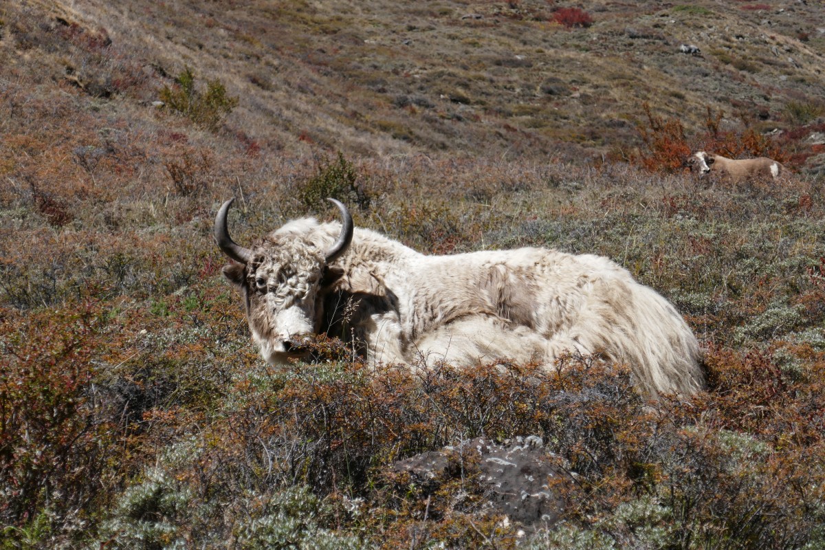 Der Weg kreuzt eine Yakherde. Die zotteligen Giganten beobachten uns in Ruhe - gottseidank... Niemand möchte einem wütenden Yak gegenüberstehen.