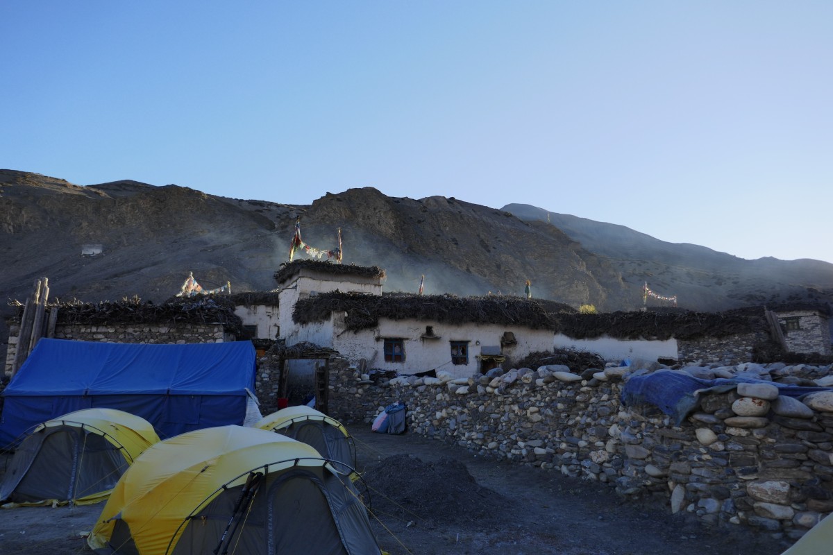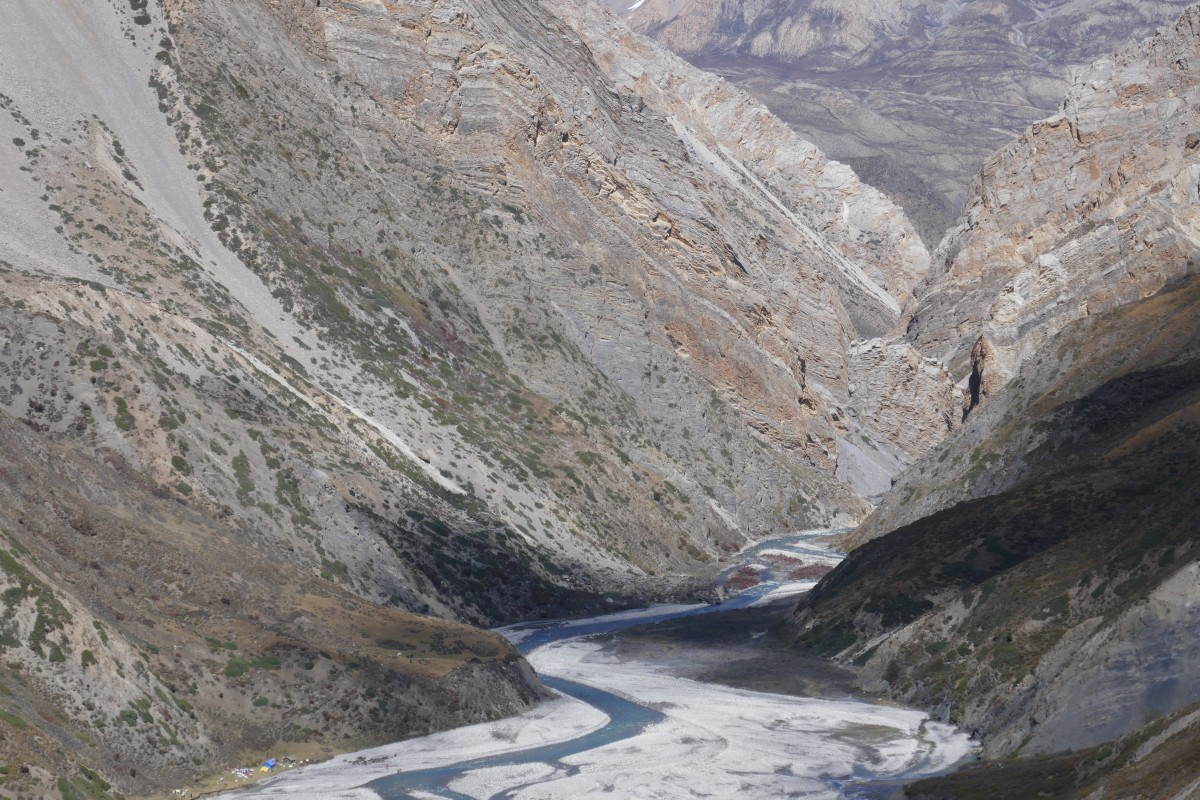 Hinter dem Lager ist bereits der Weiterweg des nächsten Tages auszumachen. Es wird spannend werden; die Schlucht des Chharka Tulsi verengt sich von beiden Seiten