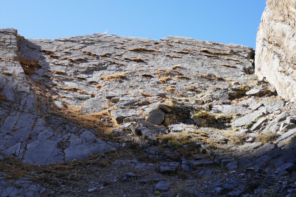 auszumachen. Danach geht es über schwer sichtbare Stufen und schließlich über die ebenso schwach erkennbare Weganlage hinunter zum Talgrund.
