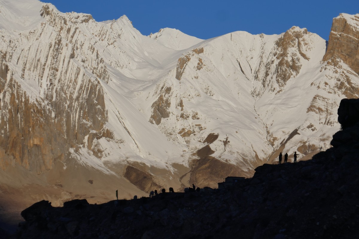 Im Rückblick nach Süden baut sich am Horizont die gewaltige Nordflanke des Dhaulagiri II auf.