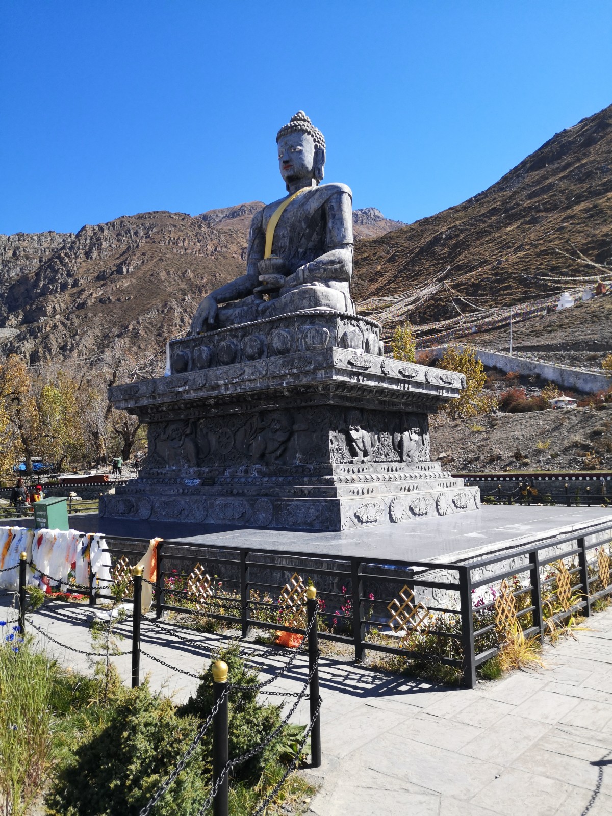 Eine große Buddha-Statue im Freien überblickt die Umgebung.