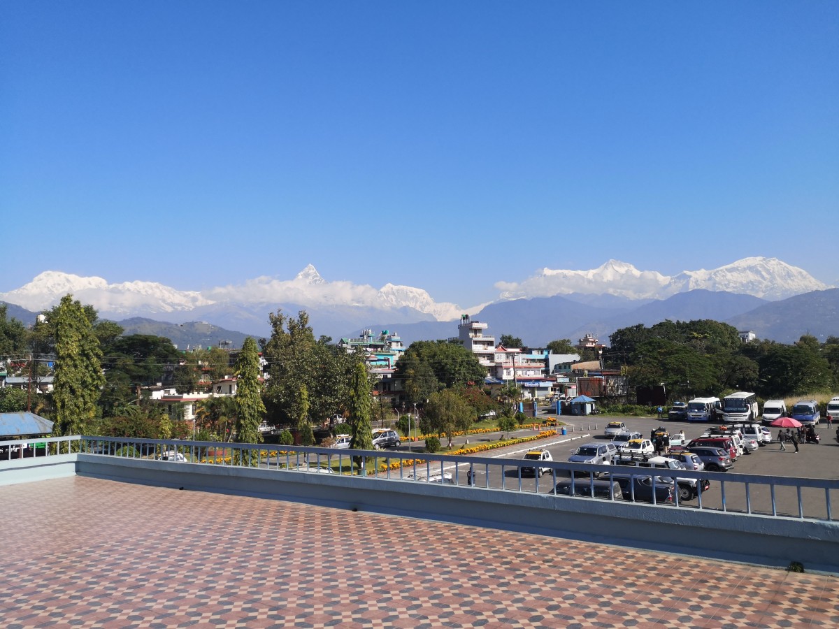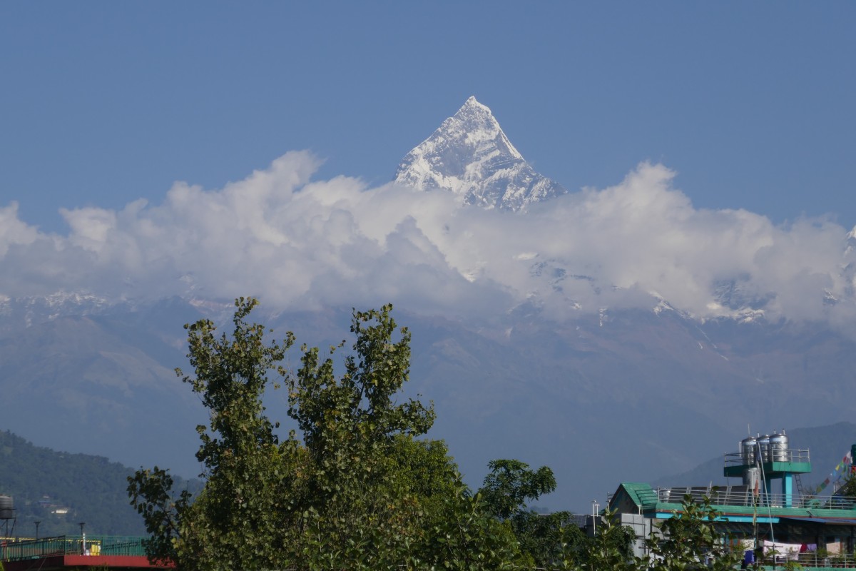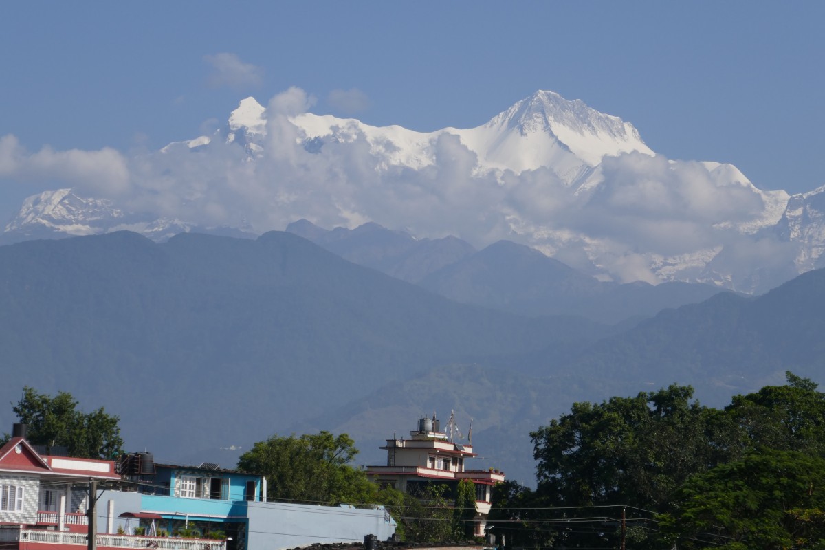 wir den Postkartenausblick auf die verschiedenen Gipfel der Annapurna, Machapuchare und Lamjung Himal bei Kaffee oder Masala Tea.