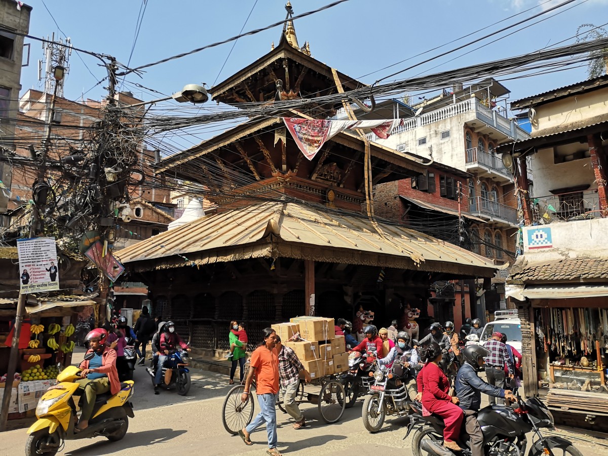 Die kleine Pagode wird vom hektischen täglichen Leben Kathmandus regelrecht umspült.