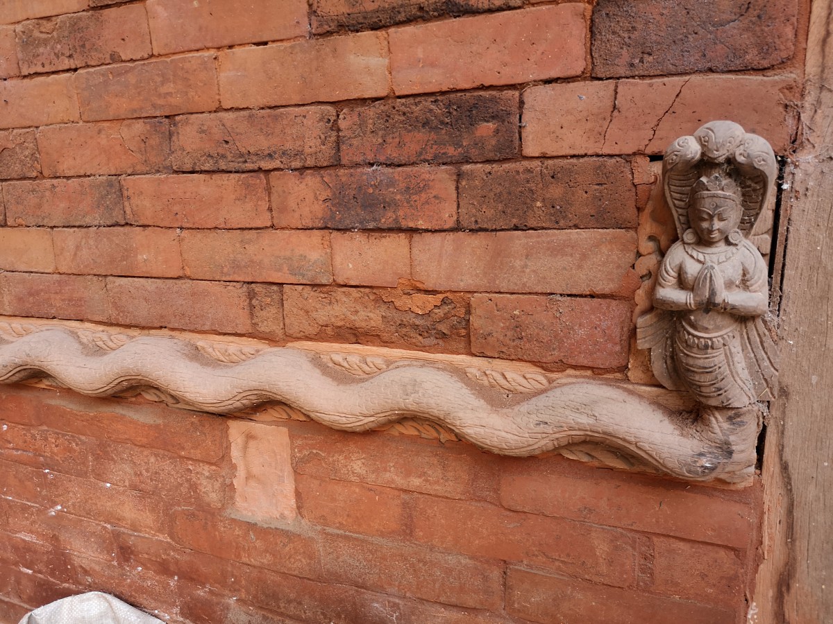 Der querlaufende Balken ist mit dem Leib einer Naga-Schlage verziert, während das darüberliegende Balkenende den menschlichen Oberkörper trägt.