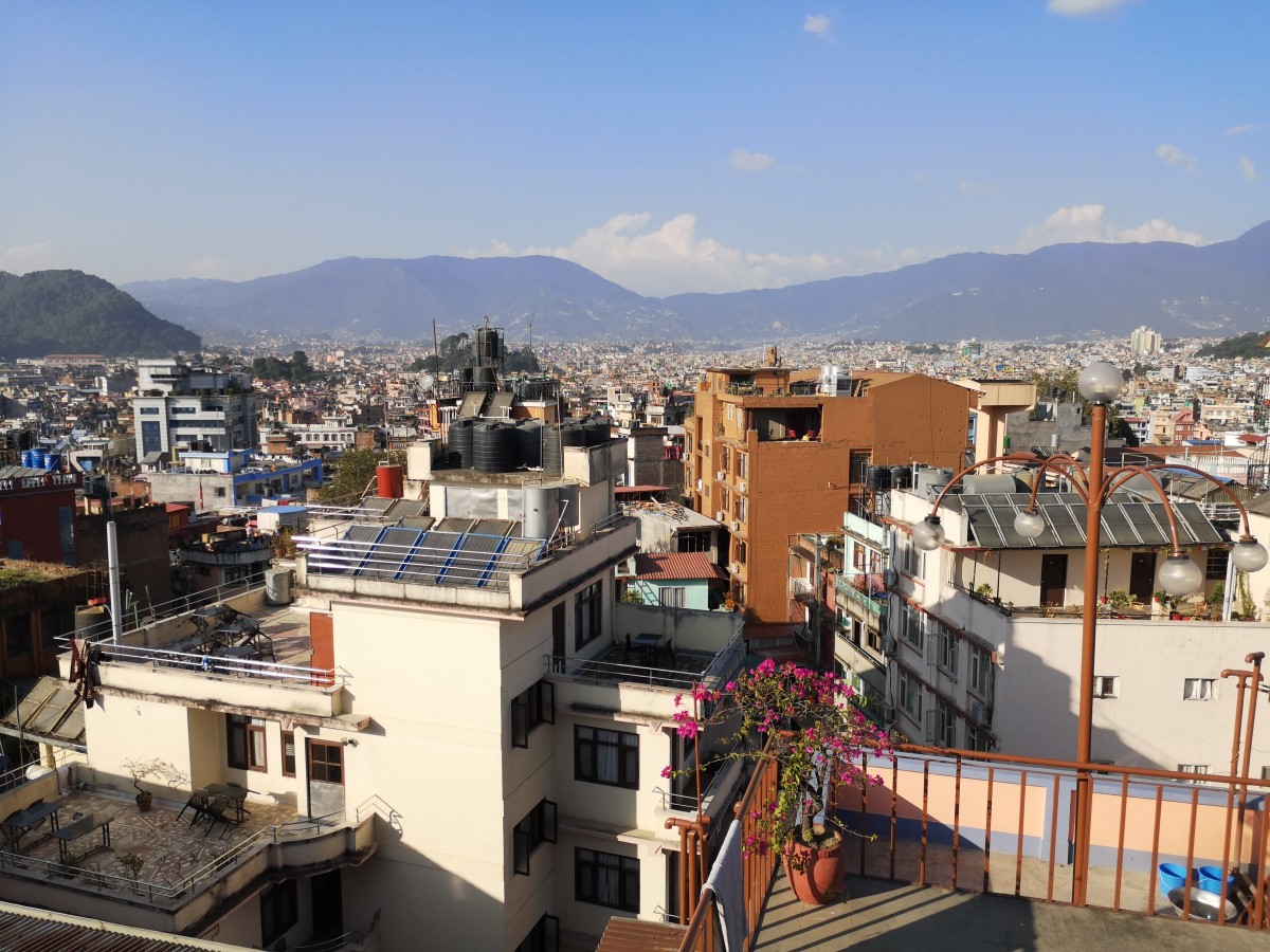 ...ehe wir uns mit einem letzten Blick über die Dächers Kathmandu von unserem Hotel aus von Nepal verabschieden. In der Nacht werden wir an den Flughafen