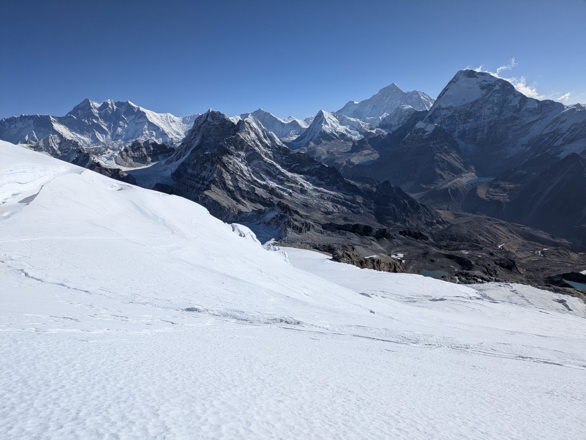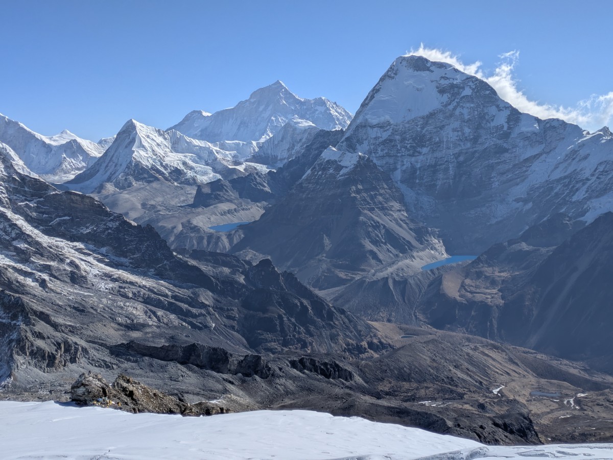 Blick hinüber zum stark vergletscherten Naulekh, einem Nachbargipfel zum Mera Peak.