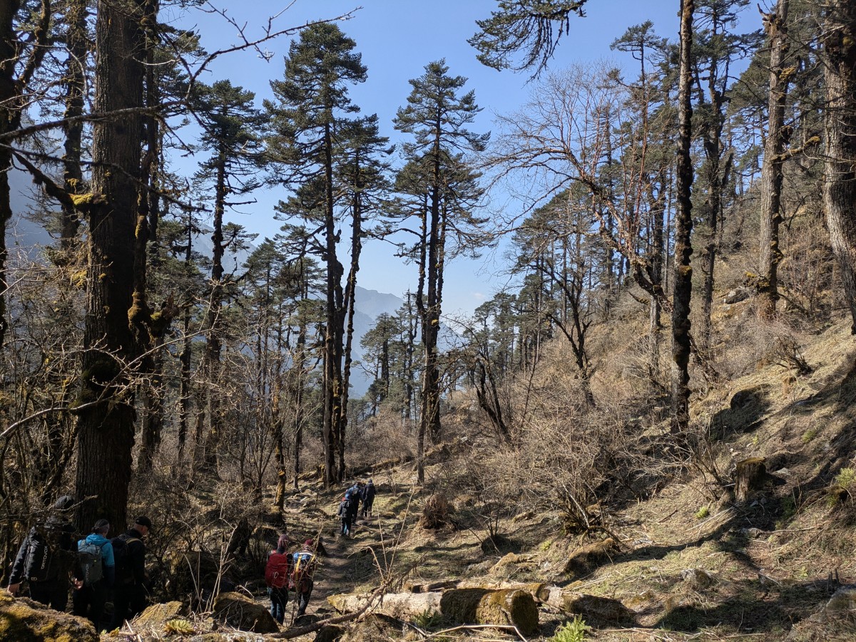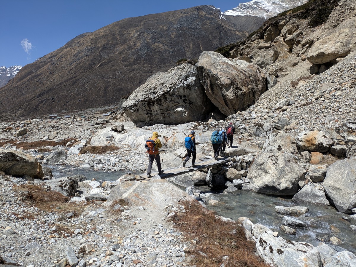 zehn Uhr vormittags wieder hinunter nach Khare geht. Dort laufen wir nach Mittag ein - das Gipfelabenteuer ist gesund und