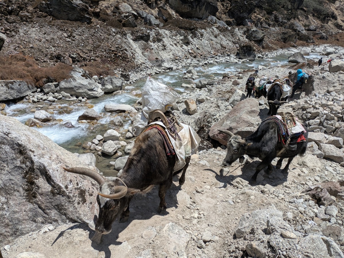 Eine Karawane kommt uns von Kothe entgegen - es sind Kreuzungen aus Yaks und Rindern.