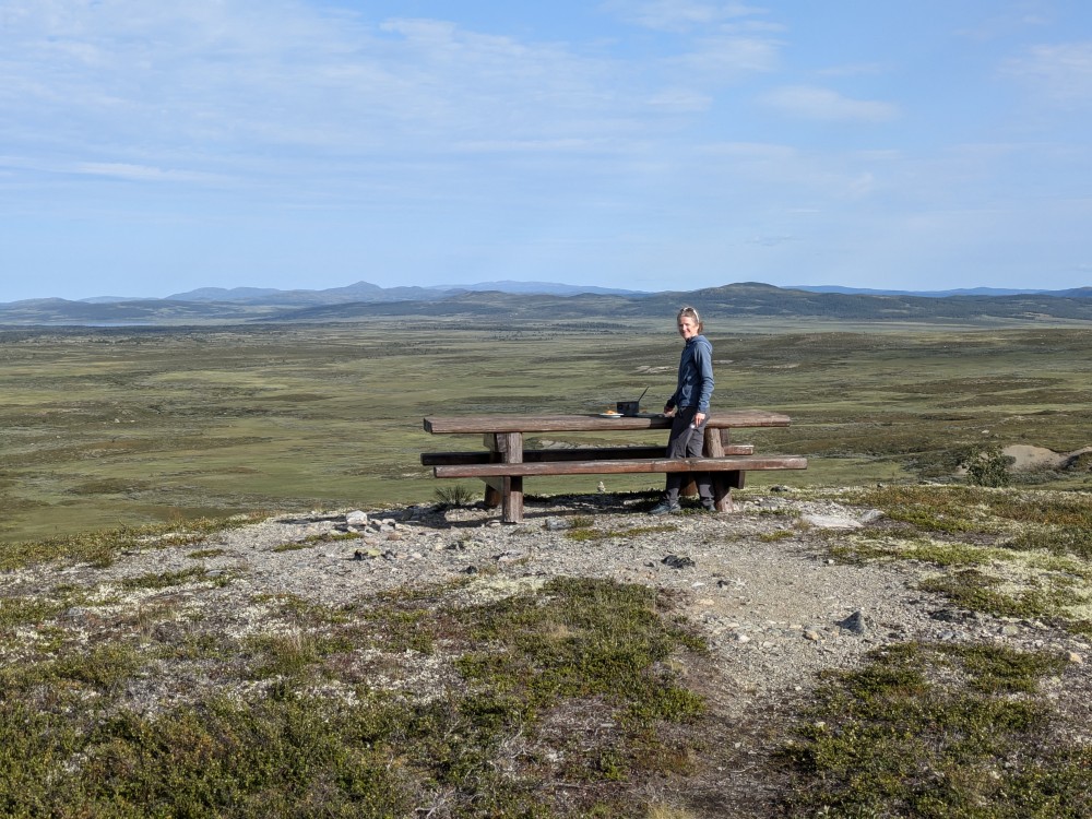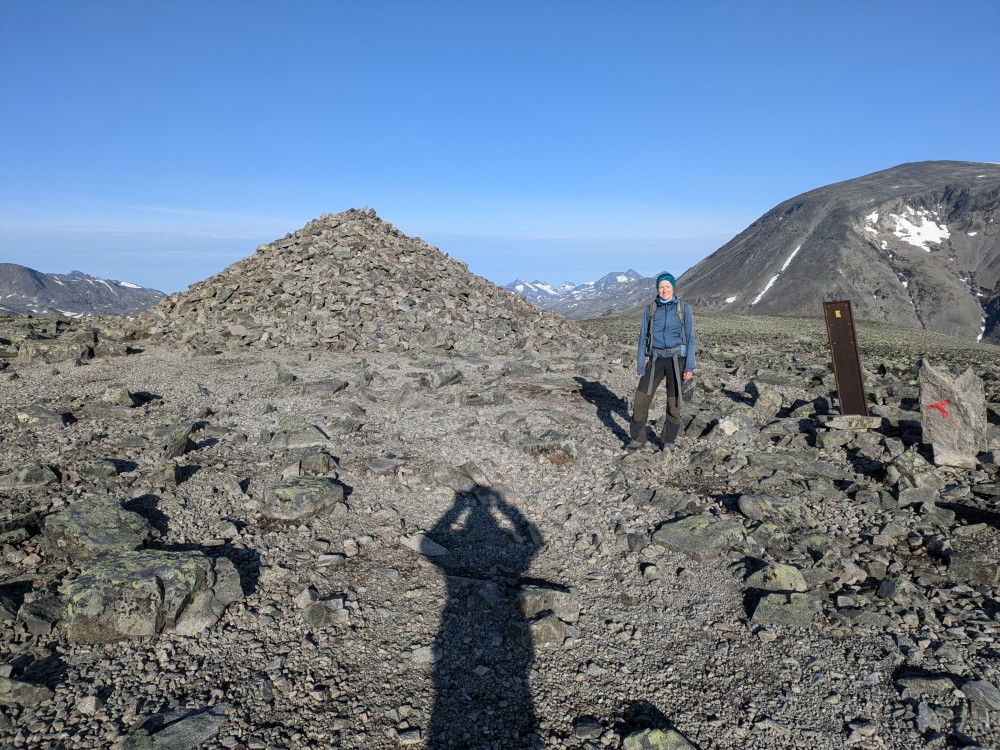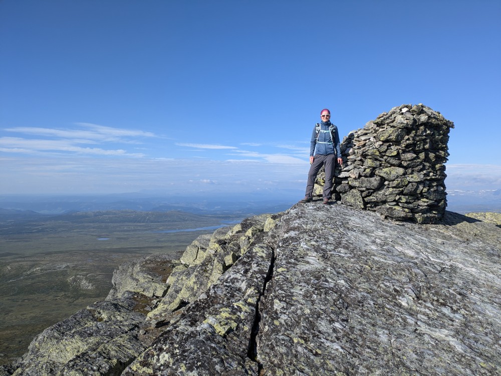 Nur wenig später stehen wir um acht Uhr morgens am höchsten Punkt der heutigen Wanderung, dem Gipfel des Veslfjellets.