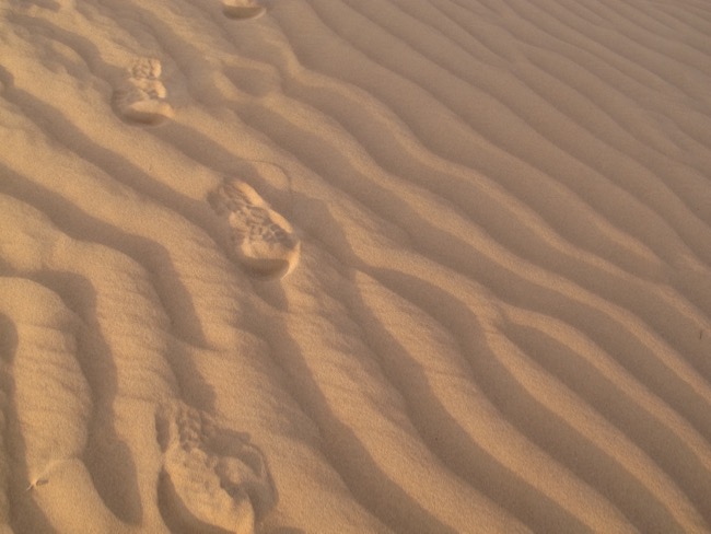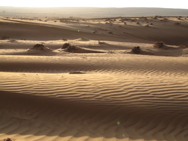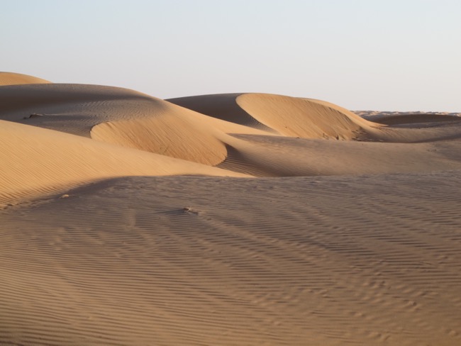 Am Abend zeigen sich die Konturen der Sanddünen in verschiedensten Schattierungen.