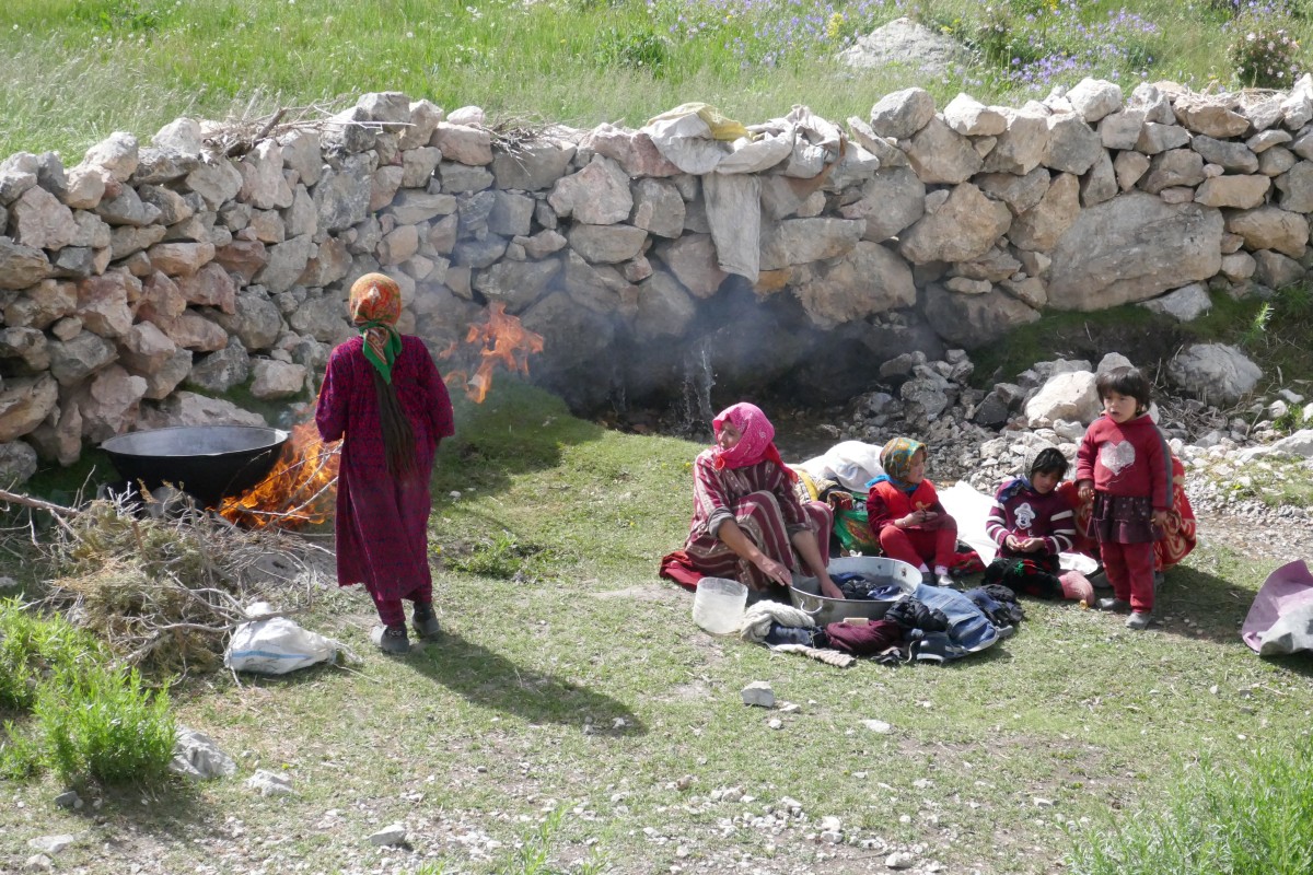 Hirten waschen Wäsche. Heißwasser wird in der großen Blechschale über einem Feuer bereitet, nebenan wird fleißig geschrubbt.