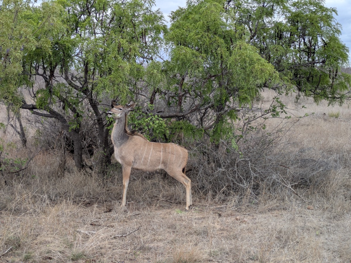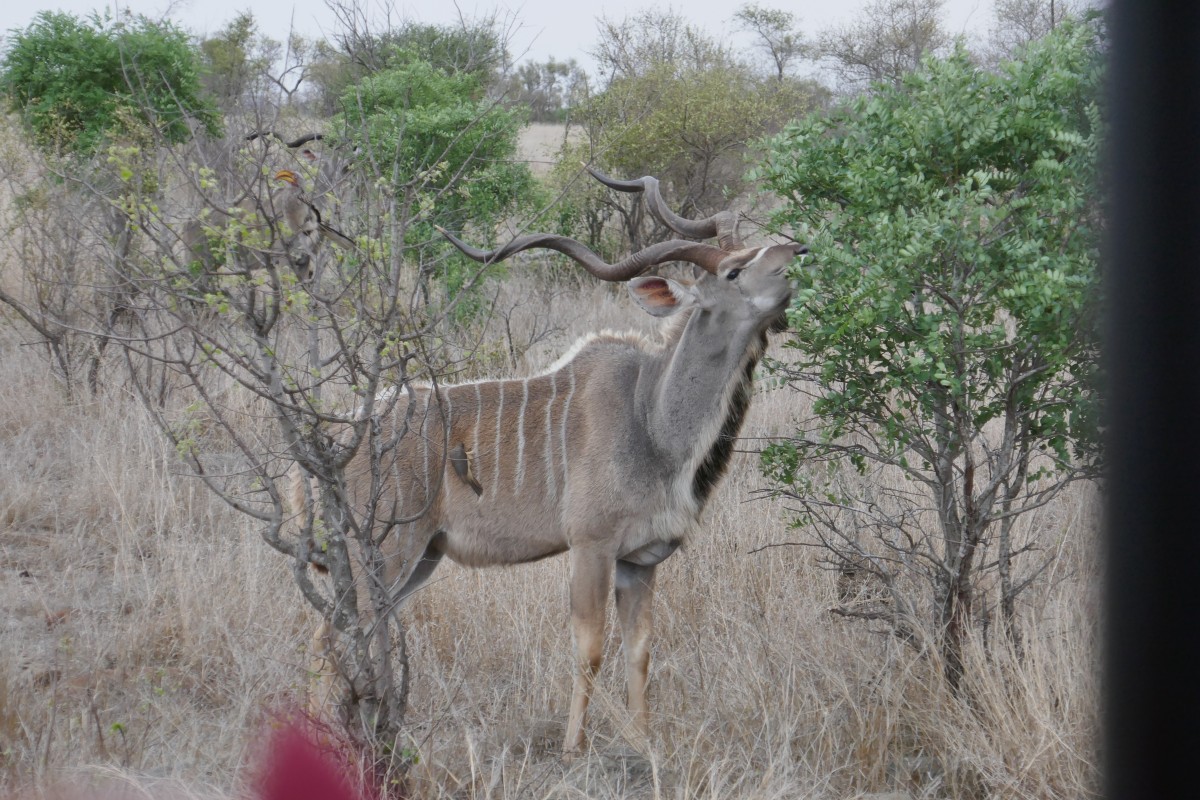 Nachdem wir uns an der Szene sattgesehen haben, geht es weiter in den Park. Uns ist klar, daß wir mit hoher Wahrscheinlichkeit schon das Wildeste gesehen haben, was uns die nächsten drei Tage widerfahren wird - einen Haupttreffer eines speisenden Löwenrudels hat man nur sehr selten. Dennoch erfreuen wir uns auch an den anderen Bewohnern des Krüger-Nationalparks: Hier ein Kudu.