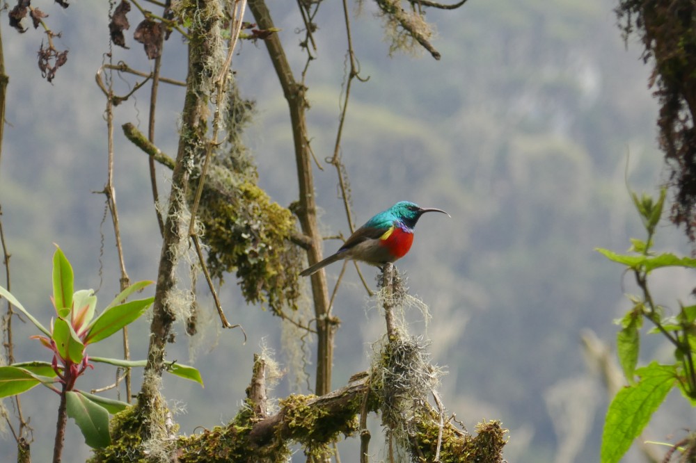 Am nächsten Tag schließt sich mit der Etappe zurück zur Nyabitaba-Hütte der Kreis des Trekkings. Ein Malachite Sunbird