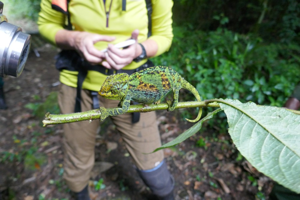 Am nächsten Tag laufen wir zurück in die Zivilisation. Kurz vor Ende des Trekkings bekommen wir noch ein Chamäleon vor die