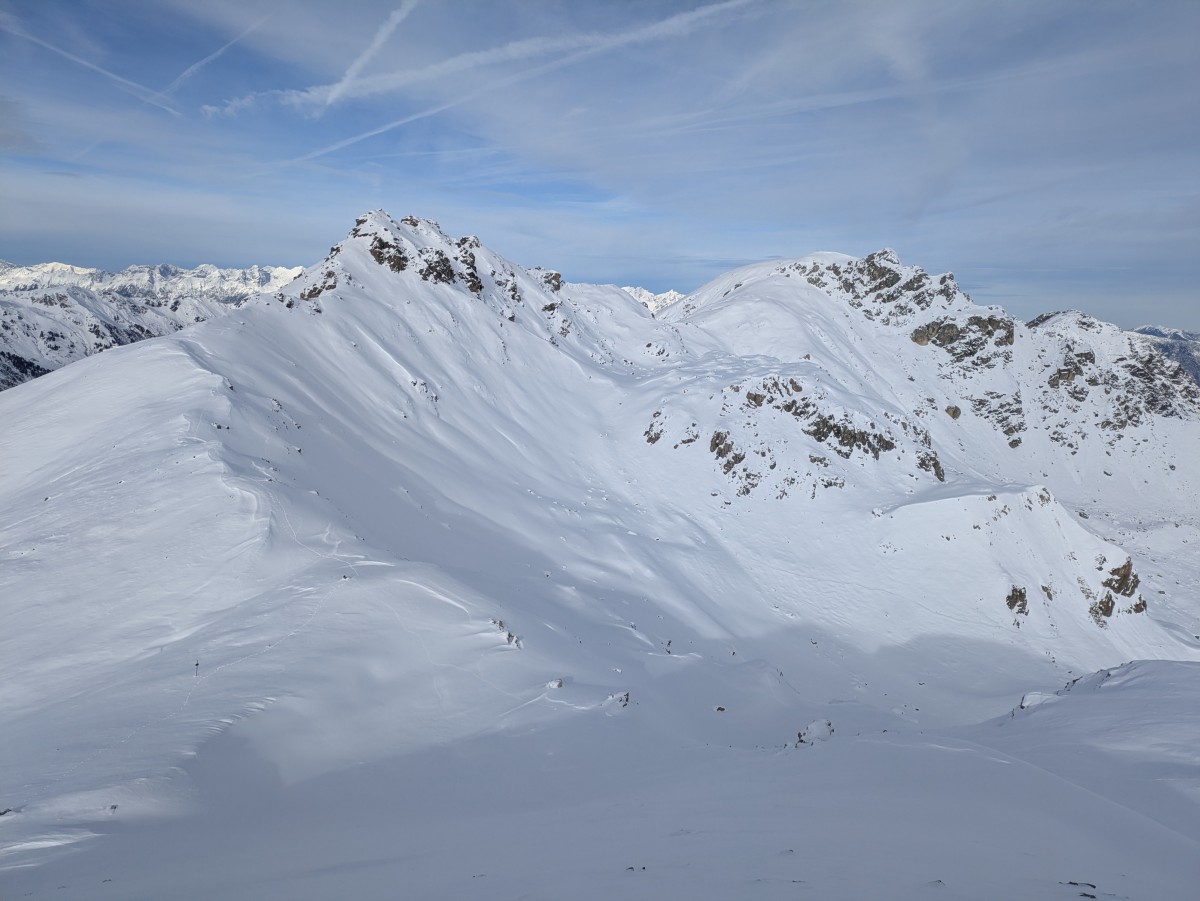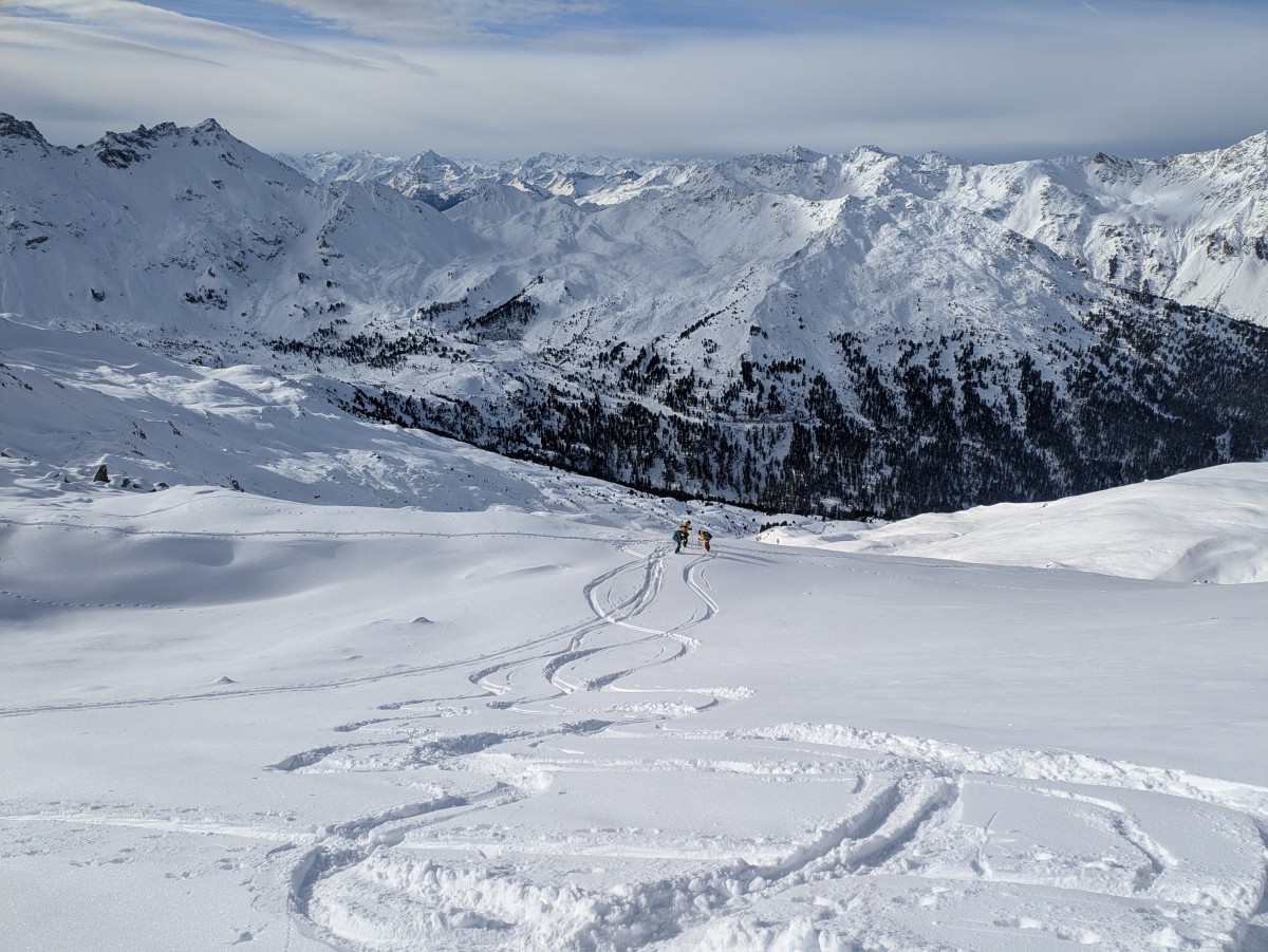 Mit Genuß machen wir uns an die ersten Schwünge in dieser Skisaison im freien Gelände. Ich freue mich an der Abfahrt, auch wenn ich mir an einem versteckten Stein einen tiefen Kratzer hole. Na, wo gehobelt wird, fallen halt Späne.