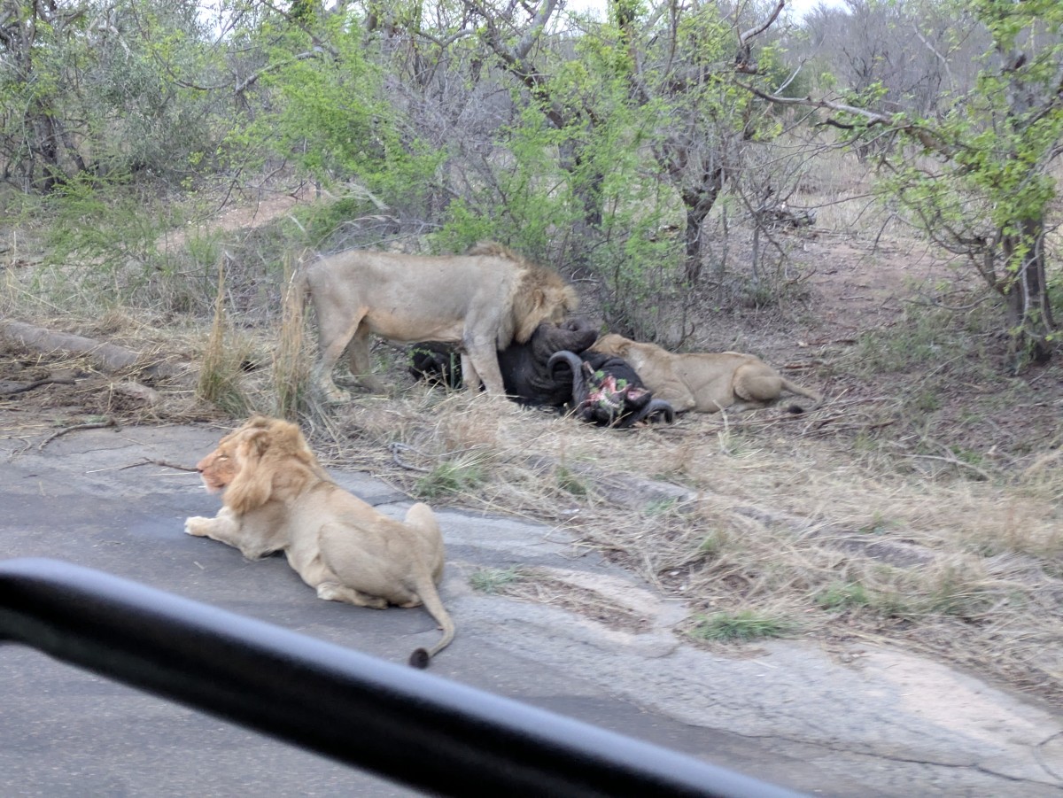Bei der Ausfahrt aus dem Park kommen wir noch einmal am Büffelriß vorbei. Mittlerweile sind andere Löwen beim Fressen zu beobachten, insbesondere zwei junge Männchen.
